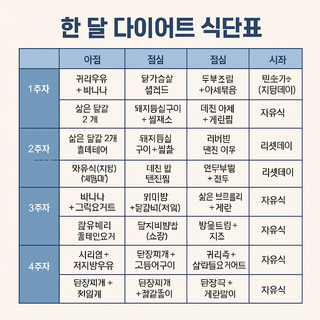 한 달 다이어트 식단의 핵심은 지속 가능성 + 영양 밸런스입니다.