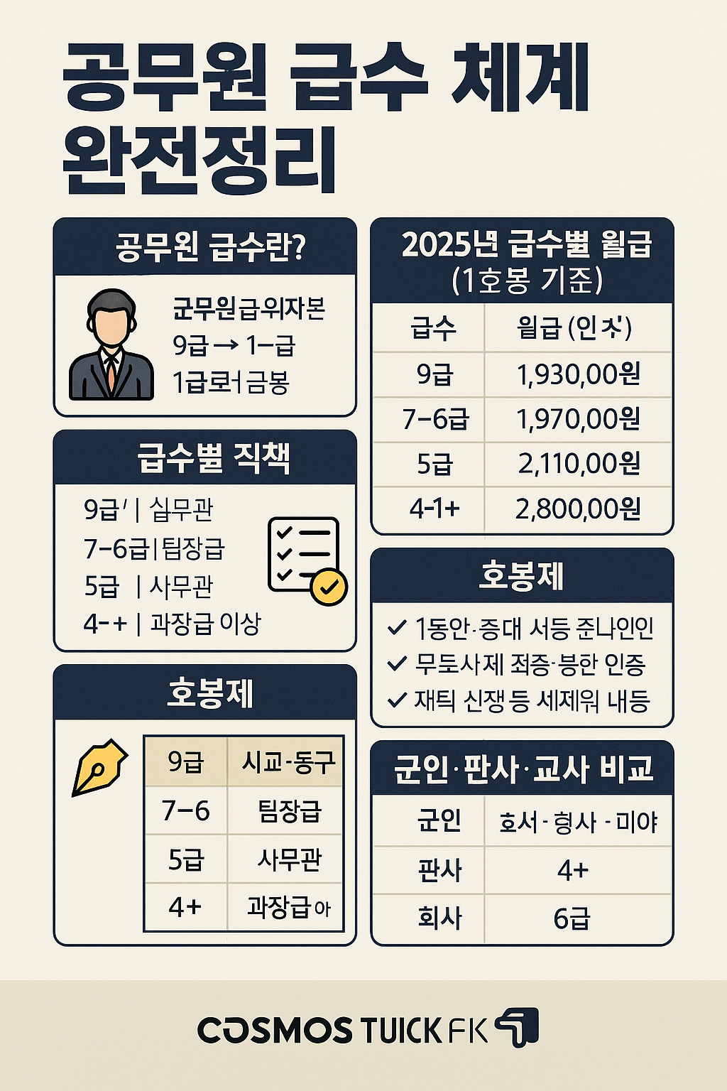 공무원 급수 체계 완전정리: 급수별 월급, 직책, 호봉, 군인·판사·검사·교육직 비교까지