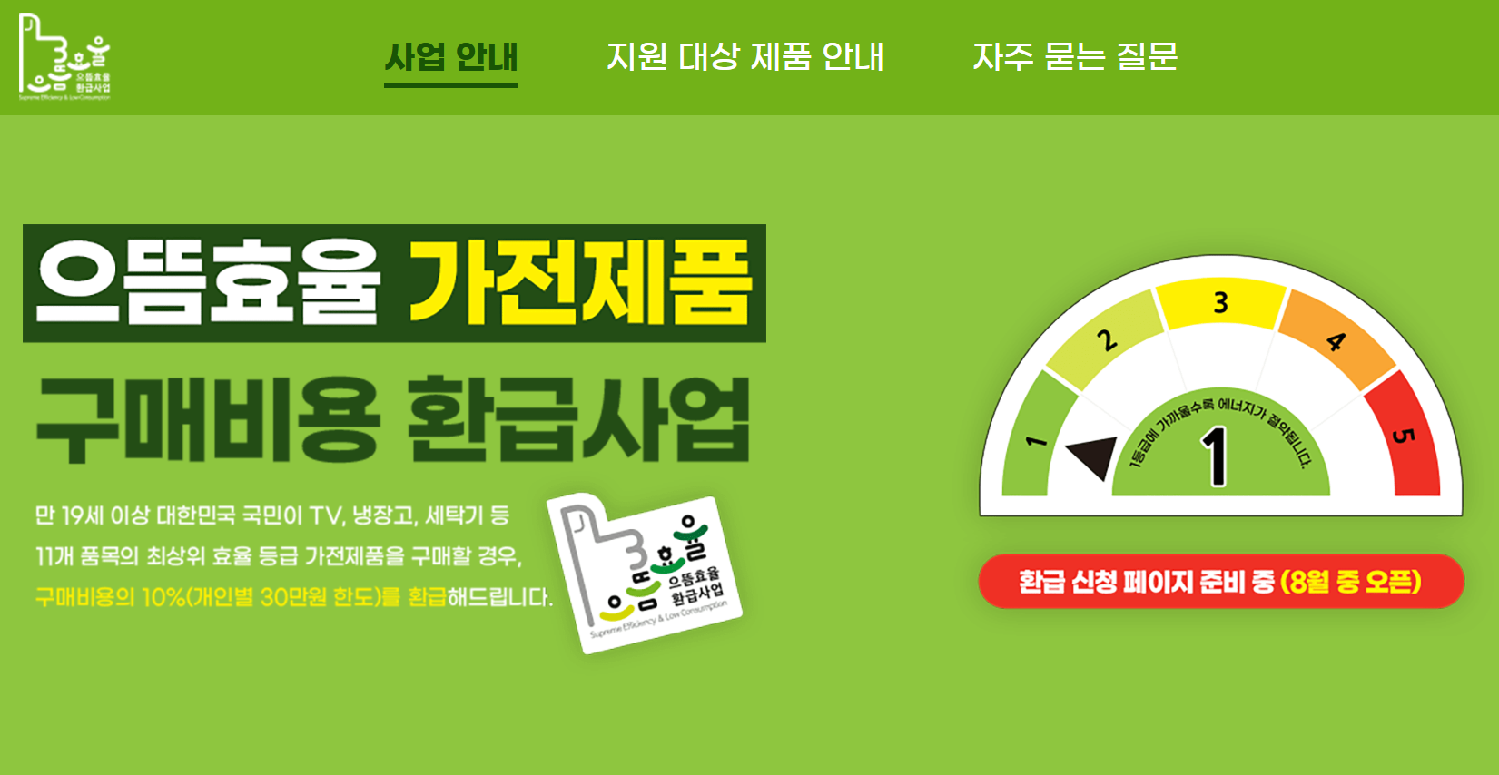 만 19세 이상 대한민국 국민이 TV, 냉장고, 세탁기 등 11개 품목의 최상위 효율 등급 가전제품을 구매할 경우, 구매비용의 10%(개인별 30만원 한도)를 환급해드립니다.