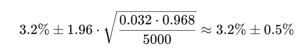 • 전환율: $ \hat{p} = \frac{160}{5000} = 0.032 = 3.2% $