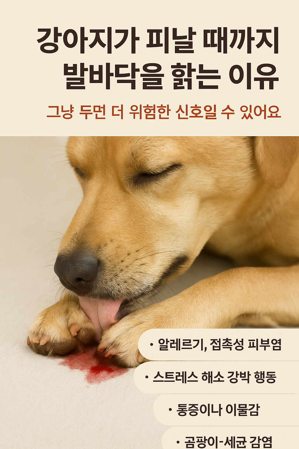 강아지가 발바닥을 계속 핥다가 피가 날 정도가 되면, 단순한 습관으로 넘기기엔 위험합니다. 이는 단순한 간지러움이나 스트레스를 넘어서, 심각한 신체적 또는 심리적 이상을 나타내는 행동일 수 있기 때문입니다. 반려견의 입장에서 보면, 발바닥은 신체의 ‘끝단’이자 민감한 부위인데요, 이런 부위를 피가 날 때까지 핥는다는 건 그만큼 간절한 이유나 고통이 있다는 뜻입니다.