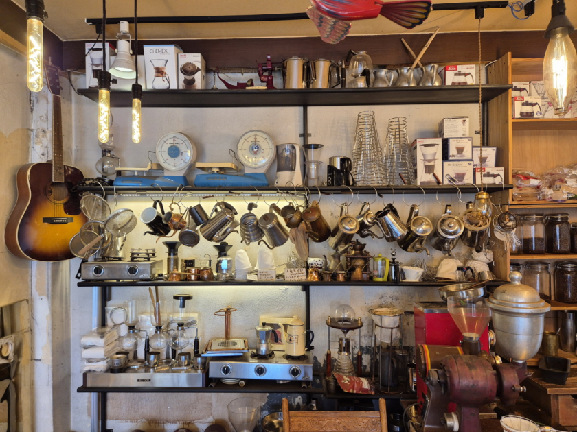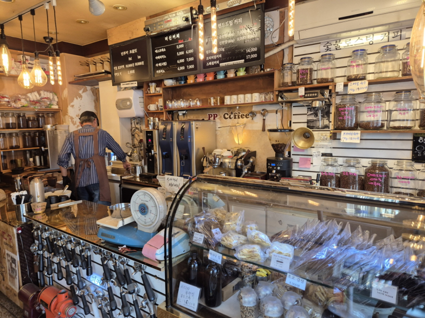 공간 구석구석에는 커피 관련 서적, 독립 출판물, 수제 도자기 소품 등이 진열되어 있어 마치 작은 갤러리에 온 듯한 느낌도 주었습니다. 조도는 낮지만 자연광이 충분히 들어와 낮에는 사진 찍기에도 좋은 분위기를 자아냅니다.