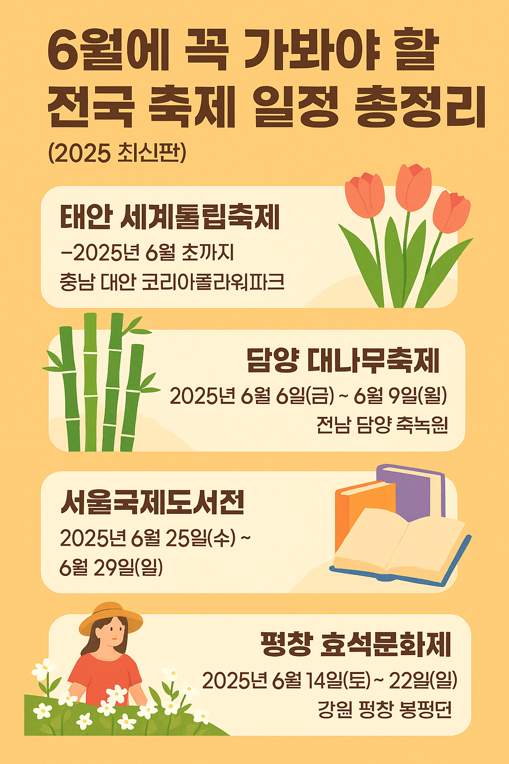 이번 포스팅에서는 2025년 6월 전국에서 열리는 추천 축제 일정을 한눈에 보기 쉽게 정리해드릴게요.
